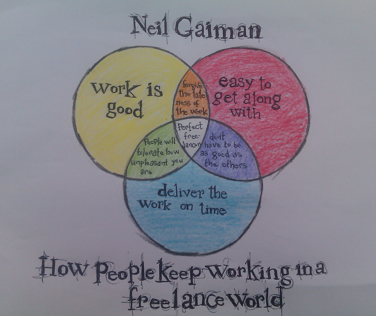 Neil Gaiman recently described how the freelance work really works. Bats and Bones sketched out a circle graph highlighting the basics of the speech. I’ve posted it below.